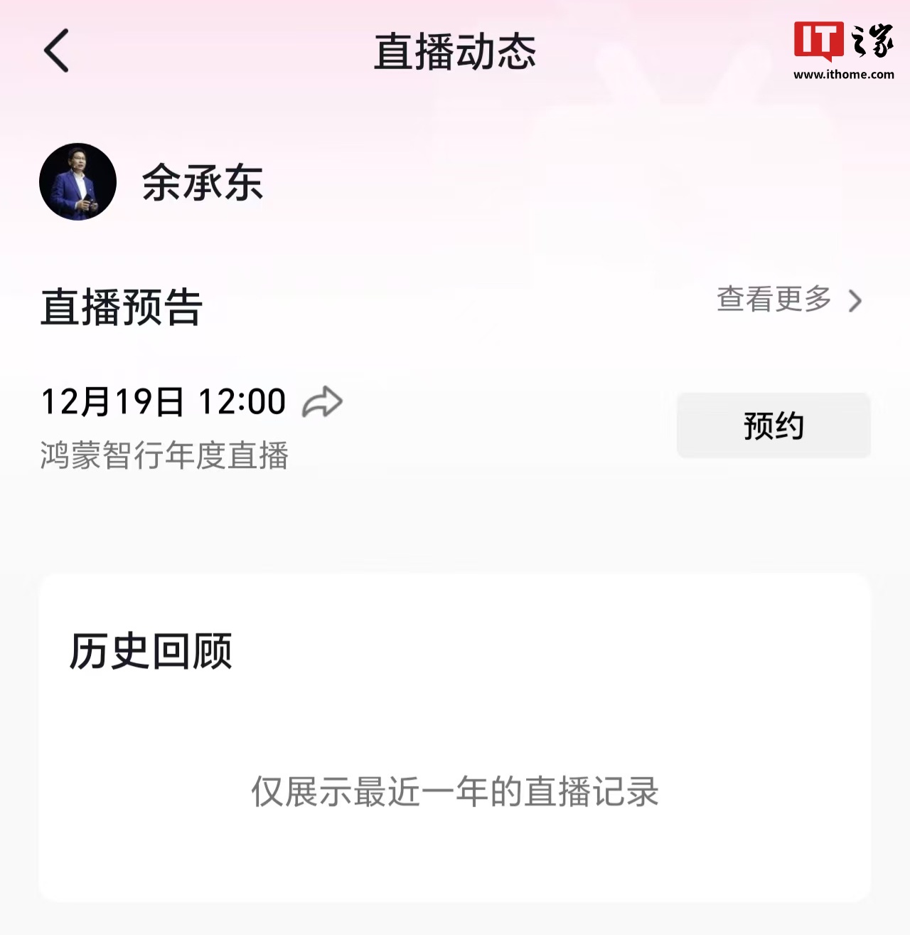 IT之家留神到,余承东的抖音账号现发布直播动态预报,关联页面深化,鸿蒙智行年度直播定档 12 月 19 日 12:00。