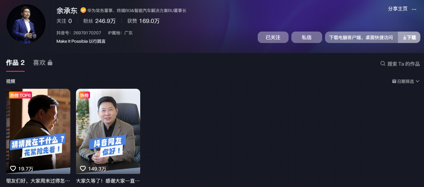 IT之家 12 月 16 日音问,华为常务董事、末端 BG & 智能汽车责罚决策 BU 董事长余承东在 12 月 12 日绽开抖音账号。当今该账号已发布两条动态视频。