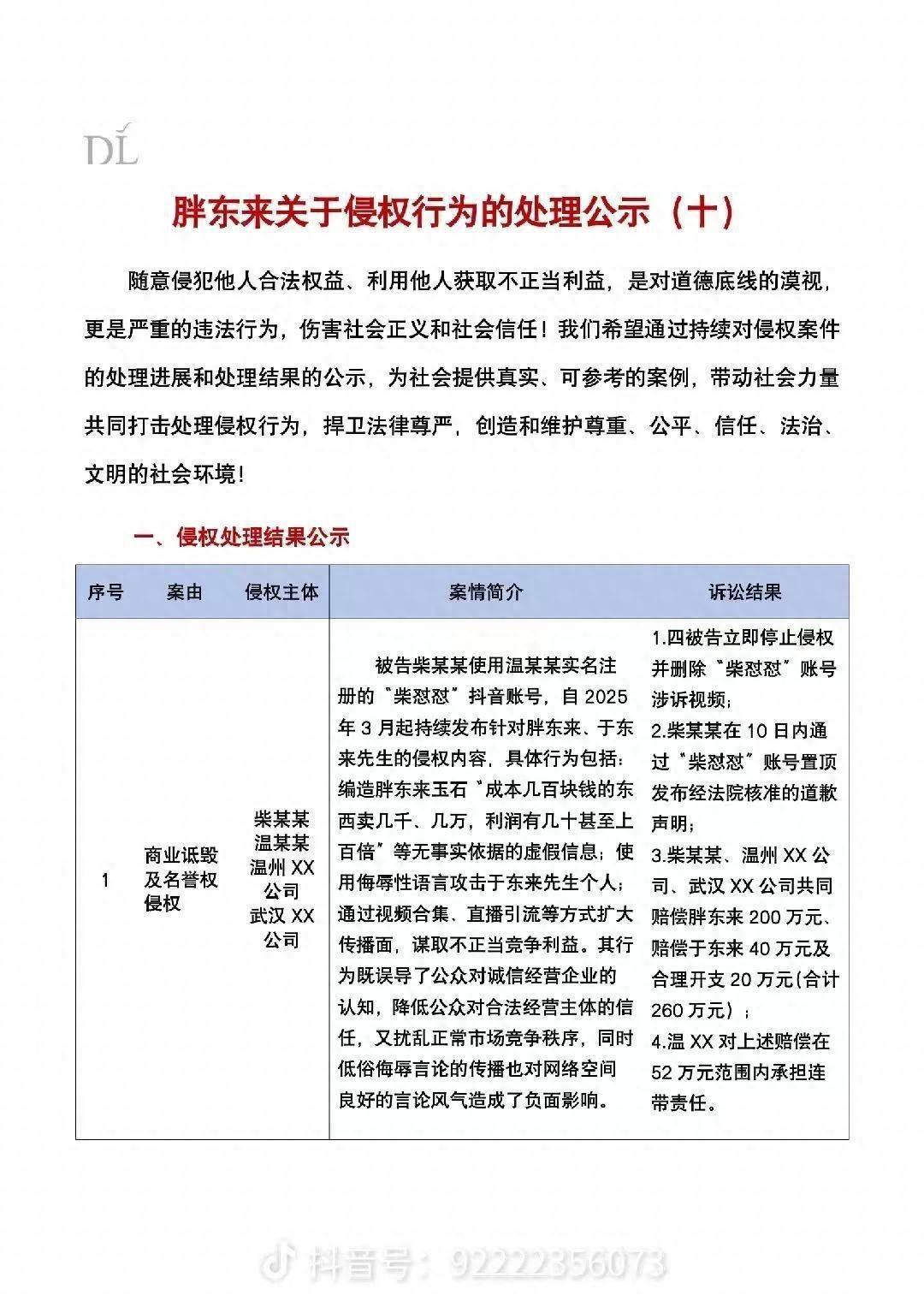 【大河财立方音信】11月11日开云体育,胖东来发布对于侵权行径的惩处效果公示,其中对于“柴怼怼案”的诉讼效果为: 1.四被告立即住手侵权并删除“柴怼怼”账号涉诉视频; 2.柴某某在10日内通过“柴怼怼”账号置顶发布经法院核准的说念歉声明; 3.柴某某、温州XX公司、武汉XX公司共同补偿胖东来200万元、补偿于东来40万元及合理开支20万元(筹谋260万元); 4.温XX对上述补偿在52万元鸿沟内承担连带包袱。 胖东来默示,简易滋扰他东说念主正当权利,诈欺他东说念主获得不耿介利益,是对说念德底线