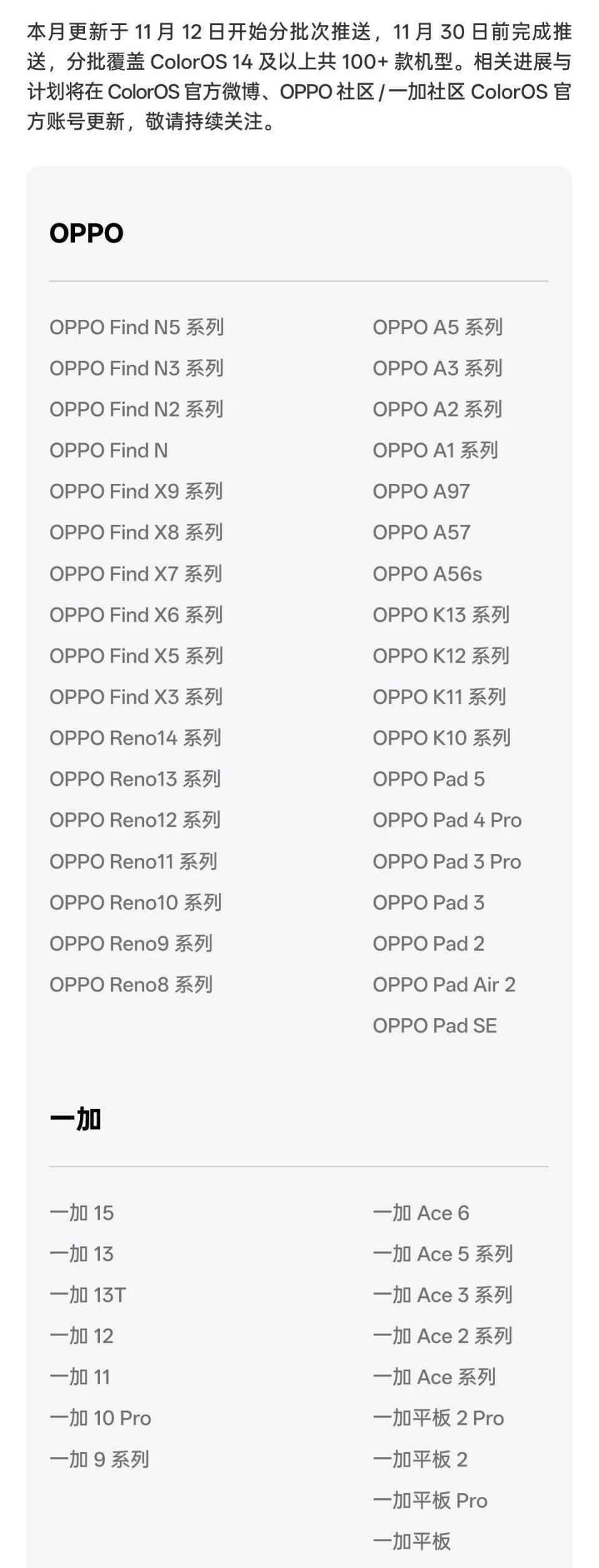 适配机型还挺多的,ColorOS 14 以上共 100+ 款机型王人能更新。