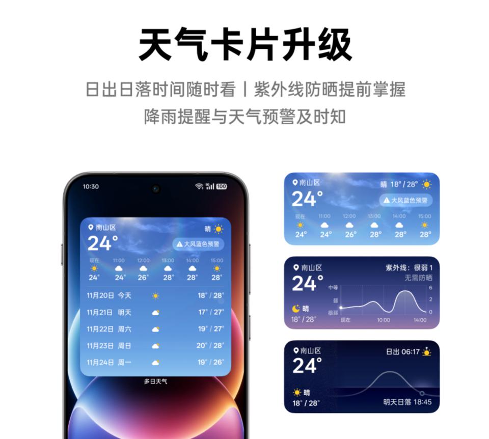此外,天气 App 优化了桌面卡片,不错看到紫外线、日出日落、降雨教导、天气预警等信息。