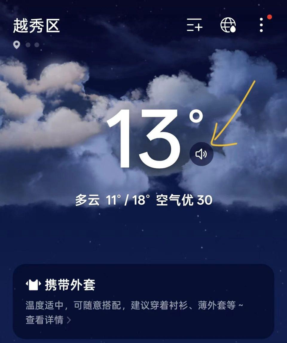 天气 App 新增语音播报功能,点击刻下温度右边的小喇叭就能听。