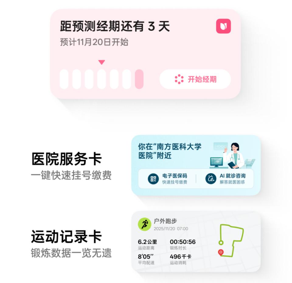 小布淡薄的桌面小部件,也新增了生理周期、病院处事、畅通纪录卡片。