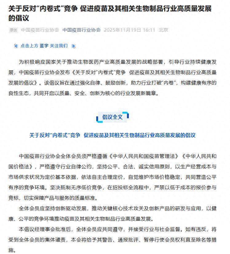 中国疫苗行业协会发声“反内卷”。图片起原:中国疫苗行业协会微信公众号